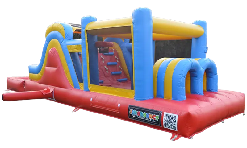 This is the 2025 Commercial Grade Obstacle Course Elite. It requires a minimums space of 45' x 14 ' x 17' for optimal use. Dual tunnels, punching pillars, climbing wall, and a super high and wide dual slides. Suitable for all ages & adults, 1500 lbs max weight capacity.